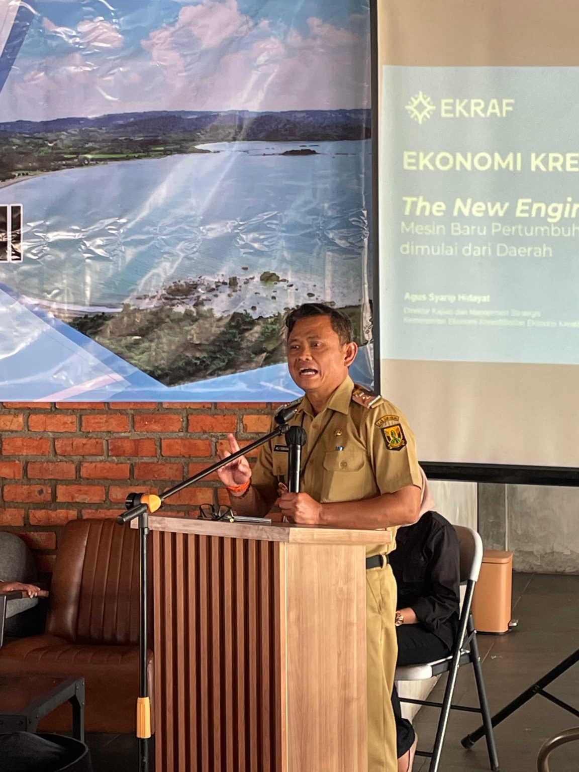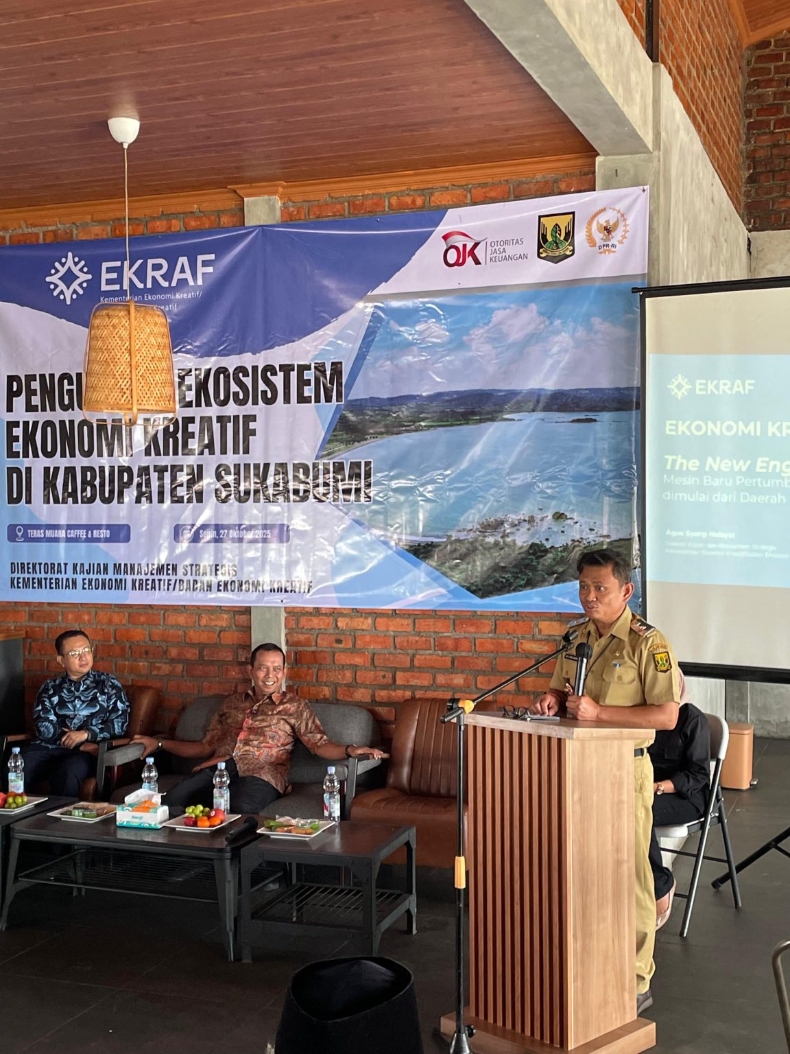SUKABUMIANNEWS.ID – Kepala Dinas Pariwisata Kabupaten Sukabumi menyampaikan sambutan yang membakar semangat Para Pelaku Ekonomi Kreatif dalam acara Pembukaan Pelatihan Pelaku Ekonomi Kreatif yang diselenggarakan oleh Kementerian Pariwisata dan Ekonomi Kreatif (Kemenparekraf/Baparekraf) dan Anggota DPR Fraksi VII Dapil Sukabumi Bapa Iman Adinugraha, SE, AKT Bertempat di Teras Muara, Palabuhanratu, Senin (27/10/2025).